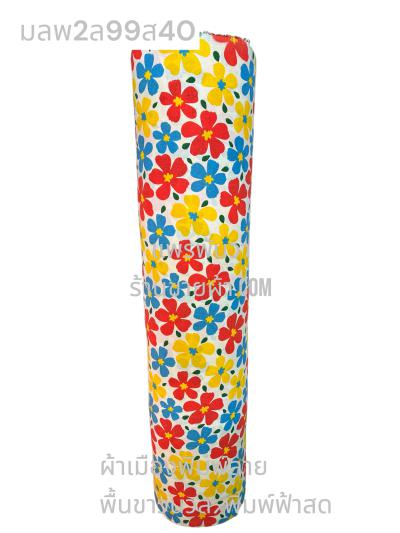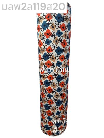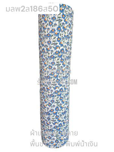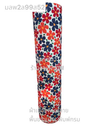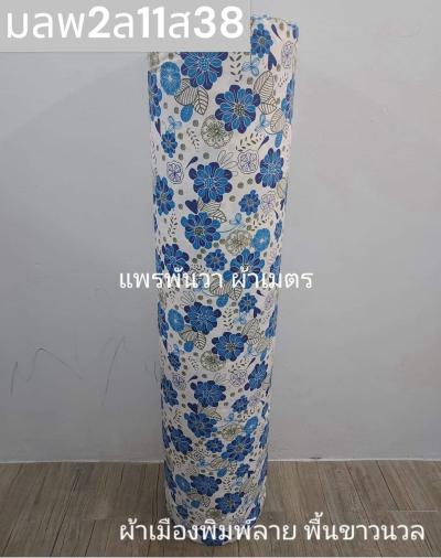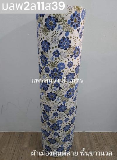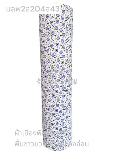 ผ้าเมืองพิมพ์ลาย(นุ่มพิเศษ)พื้นขาว พื้นขาวนวล ลายลายดอกดาหลา สีน้ำเงิน