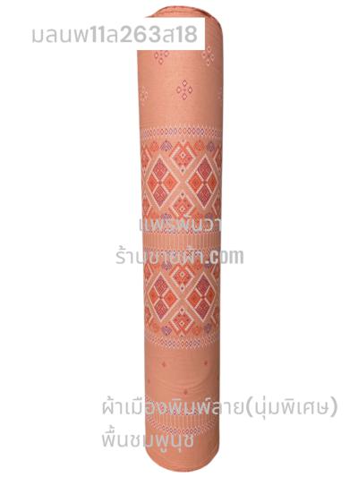 ผ้าเมืองพิมพ์ลาย(นุ่มพิเศษ)พื้นสี พื้นโอรสอ่อน ลายเพชรชมพู สีชมพูหวาน
