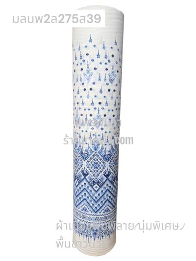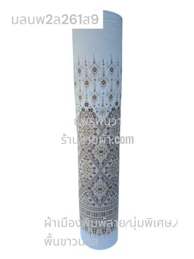 ผ้าเมืองพิมพ์ลาย(นุ่มพิเศษ)พื้นขาว พื้นขาวนวล ลายฉัตรสวรรค์ สีเปลือกไม้อ่อน